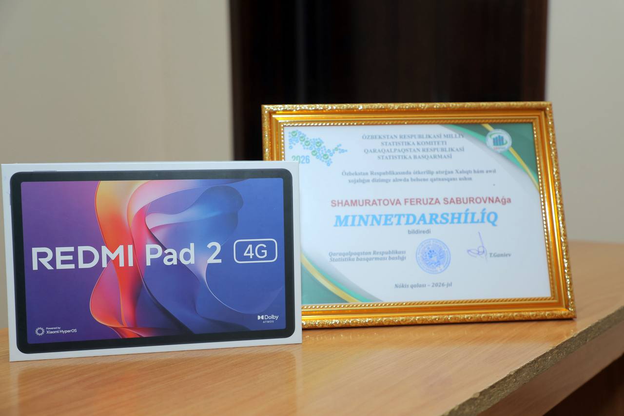 Bárshemizge belgili usı jıldıń 15-yanvar sánesinen baslap elimizde xalıqtı hám awıl xojalıǵın dizimge alıw ilájlarına rásmiy túrde start berildi. Milliy statistika komiteti tárepinen bul processte belsendilik kórsetip, sorawnamanı onlayn tárizde durıs hám tolıq toltırǵan puqaralar arasında tańlaw járiyalanǵan edi. Tańlaw nátiyjesine kóre Xojeli rayonı "Sarıshúngil" máhálle puqarası Shamuratova Feruza Saburovna jeńimpaz dep tabıldı hám zamanagóy planshettiń iesine aylandı.