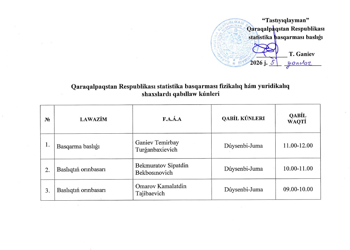 Qaraqalpaqstan Respublikası statistika basqarması basshıları fizikalıq hám yuridikalıq shaxslardı qabıllaw kestesi
